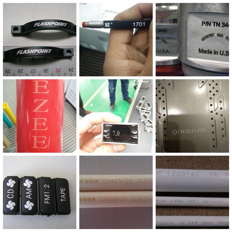 可在多種金屬和非金屬表面進行雕刻打標,廣泛應用于工業軸承、齒輪、各種汽車零件、五金工具、航天航空器件、集成電路芯片、電腦配件、鐘表、電子及通訊產品、家電、電線電纜、食品包裝、首飾、煙草等眾多領域的圖形和文字的標記。其材料包括金、銀、銅、鋁、不銹鋼、硬質合金、鍍鉻、鍍鈦等金屬,陶瓷、PVC、塑膠、環氧樹脂、皮革等非金屬材料。